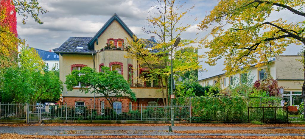 Fassade der denkmalgeschützten Gebäude in der Görresstraße 21 und 23, mit der freistehenden Landhausvilla in der Mitte.