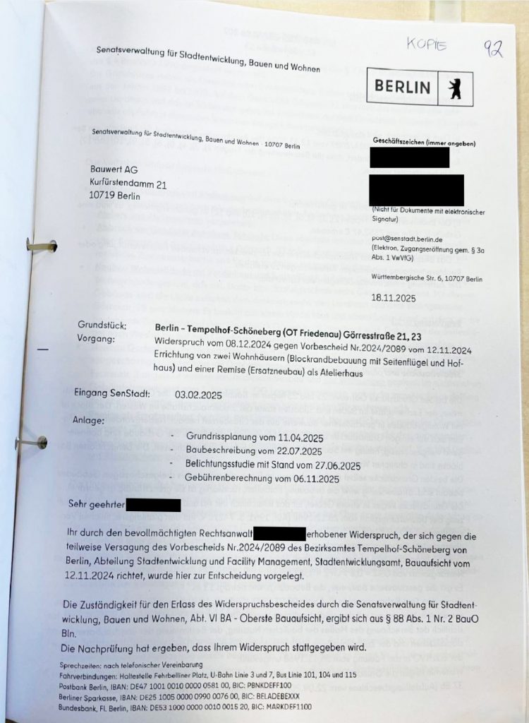 Schreiben der Senatsverwaltung vom 18.11.2025 zum Vorgang des Widerspruchs vom 08.12.2024 gegen den Vorbescheid Nr. 2024/2089 vom 12.11.2024 an die Bauwert AG im Original nach Akteneinsicht..